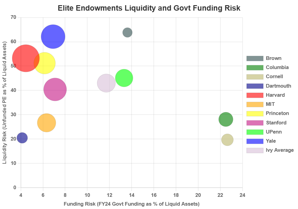 下図は、名門大学エンダウメントにおける流動性リスクと政府資金リスクを示したものです。