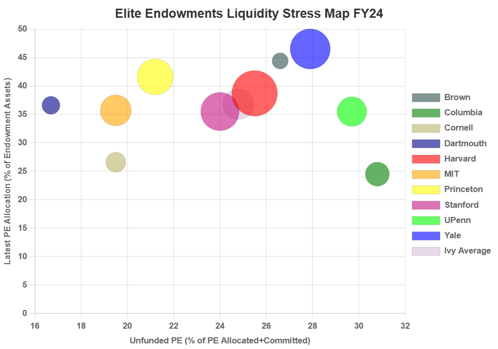 下図の名門大学基金の流動性ストレス・マップ(FY24)(「Elite Endowment Liquidity Stress Map FY24」としてMPI Transparency Labにも掲載)は、以下のように各大学基金のPE投資に伴う潜在的な流動性ストレス構造を可視化しています。