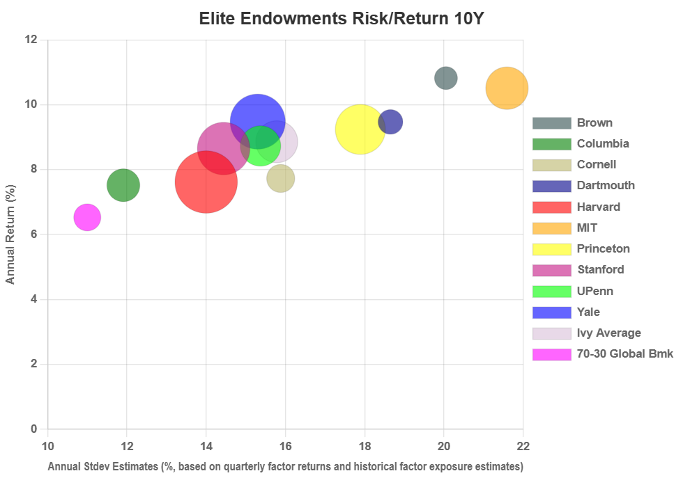 我々の分析対象である10の名門大学(スタンフォード大学やMITを含む)の中で、ダートマス大学の長期パフォーマンスはブラウン大学とMITに次ぐ第3位という結果でした。にもかかわらず、両校よりも明らかに低いリスク水準でこの成果を達成しています。